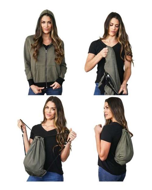 - Patented 2-in-1 hoodie converts into functional drawstring backpack in seconds
